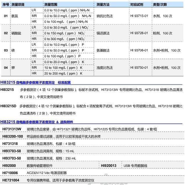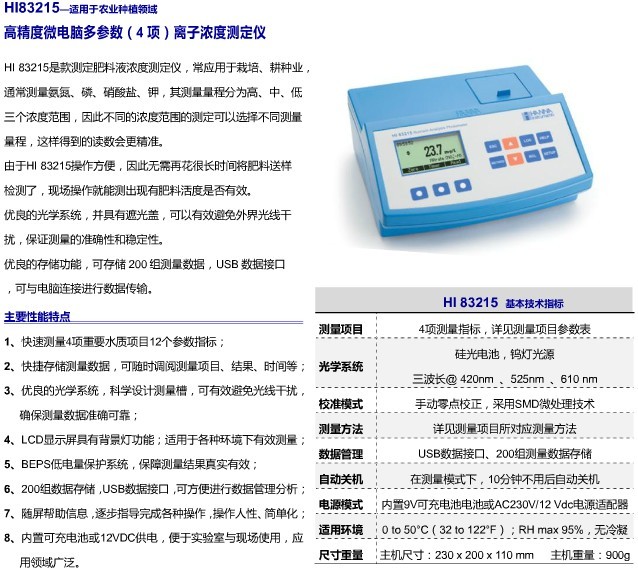 测量氨氮、硝酸盐、磷、钾、等4个项目12个水质测量参数,USB数据接口,200组数据存储,内置可充电池,便于实验室与现场使用,应用领域广泛