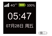 开机画面如图二,看到这个画面后,表示机器已经完成正常启动。这个界面内容有:4G信号强度,电量,时间和日期。