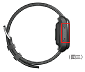 开机:长按开机按键(如图一中的红色圈圈的按键),大概35秒后松手,手表开始启动。