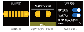 一:辐射警报设置:如图(辐射警报开关设置),这个设置界面可以设置辐射超标警报,超过警报值,手表马达会震动,同时屏幕会红屏和白屏交替切换。提醒用户当前环境辐射过大。